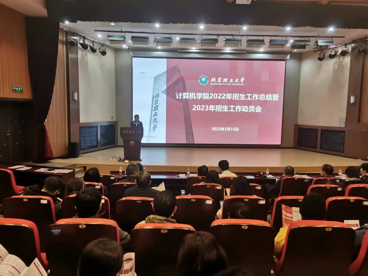 为进一步抓牢抓实招生宣传工作,积极总结,提前谋划,筑牢2023年本科招生宣传工作基础,3月15日上午,计算机学院于七号楼报告厅组织开展2022年度招生宣传工作总结会暨2023年度招生宣传工作动员会。北京理工大学招生办公室主任王浩宇、计算机学院党委书记丁刚毅、院长王国仁、副书记副院长奚英伦、副院长赵宏宇、副院长薛静锋、湖北招生组副组长韩宝玲出席本次活动,湖北招生组、青海招生组领航人共50余人参与了本次活动。活动由计算机学院招生工作干事柳文艳主持。