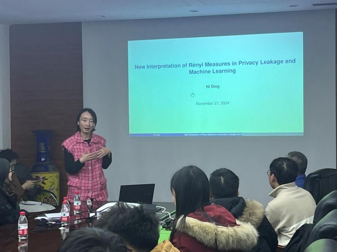 2024年11月27日,奥克兰大学丁妮博士应北京理工大学计算机学院邀请,在中心教学楼举分别作题为“隐私泄露与机器学习中的Rényi度量新解释”、“通过Kantorovich最优传输计划实现ε-Pufferfish隐私”的学术讲座,,讲座分别由计算机学院礼欣老师、胡晶晶老师主持,语言智能与社会计算研究所和网络攻防对抗研究所相关专业方向师生参加了讲座。
