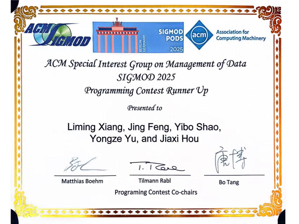 2025年6月,数据库领域全球顶级学术会议SIGMOD 2025在德国柏林落幕。经过激烈角逐,北理工计算机学院硕士研究生项黎明、封璟,本科生邵艺博、侯佳希以及来自西安电子科技大学的俞泳泽组成的Kirara队在秦宏超、李荣华、王国仁老师的指导下,获得了编程竞赛全球亚军(Programming Contest Runner Up Award),这是北理工学子首次参加该赛事。本次竞赛冠军由慕尼黑工业大学(TUM)团队夺得,清华大学团队位列第三。